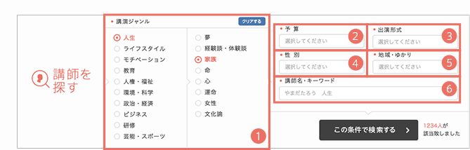 ご希望の講演会のテーマ・ジャンル、講師の専門分野から絞込み、検索することが出来ます。