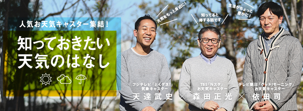 気象をめぐるニュースは近年、ますます増えている印象があります。それを日々、伝えているのが、お天気キャスターのみなさんです。気象担当として、TBS「Nスタ」に出演する森田正光さん、テレビ朝日「グッド!モーニング」の依田司さん、フジテレビ「とくダネ!」の天達武史さんの3人の人気お天気キャスターに、天気にまつわる裏話を聞いてきました。